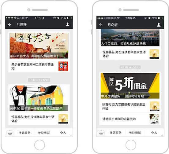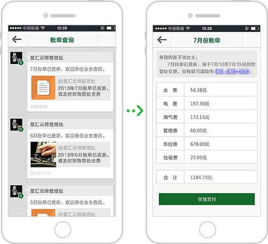 用(yòng)户可(kě)通过微信公众账号随时收到小(xiǎo)區(qū)物(wù)业信息,方便用(yòng)户随时了解社區(qū)动态,告别公告栏